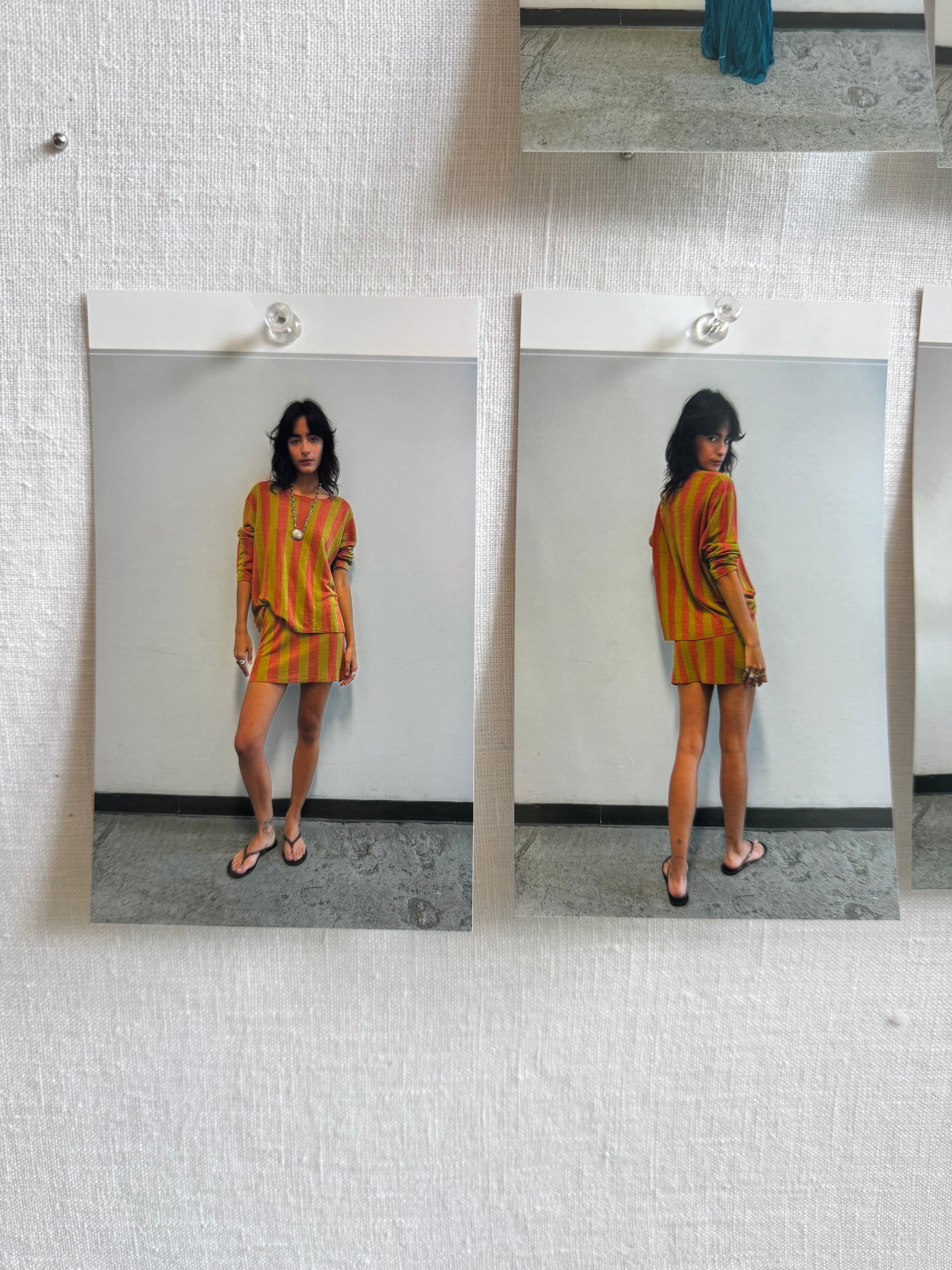 Silk and linen knit stripe-y boy. The Carlington Stripe Shell is the perfect balance between a statement piece and a versatile layering option. Made of 75% linen and 25% silk. Marita is wearing a size M in the sweater.
