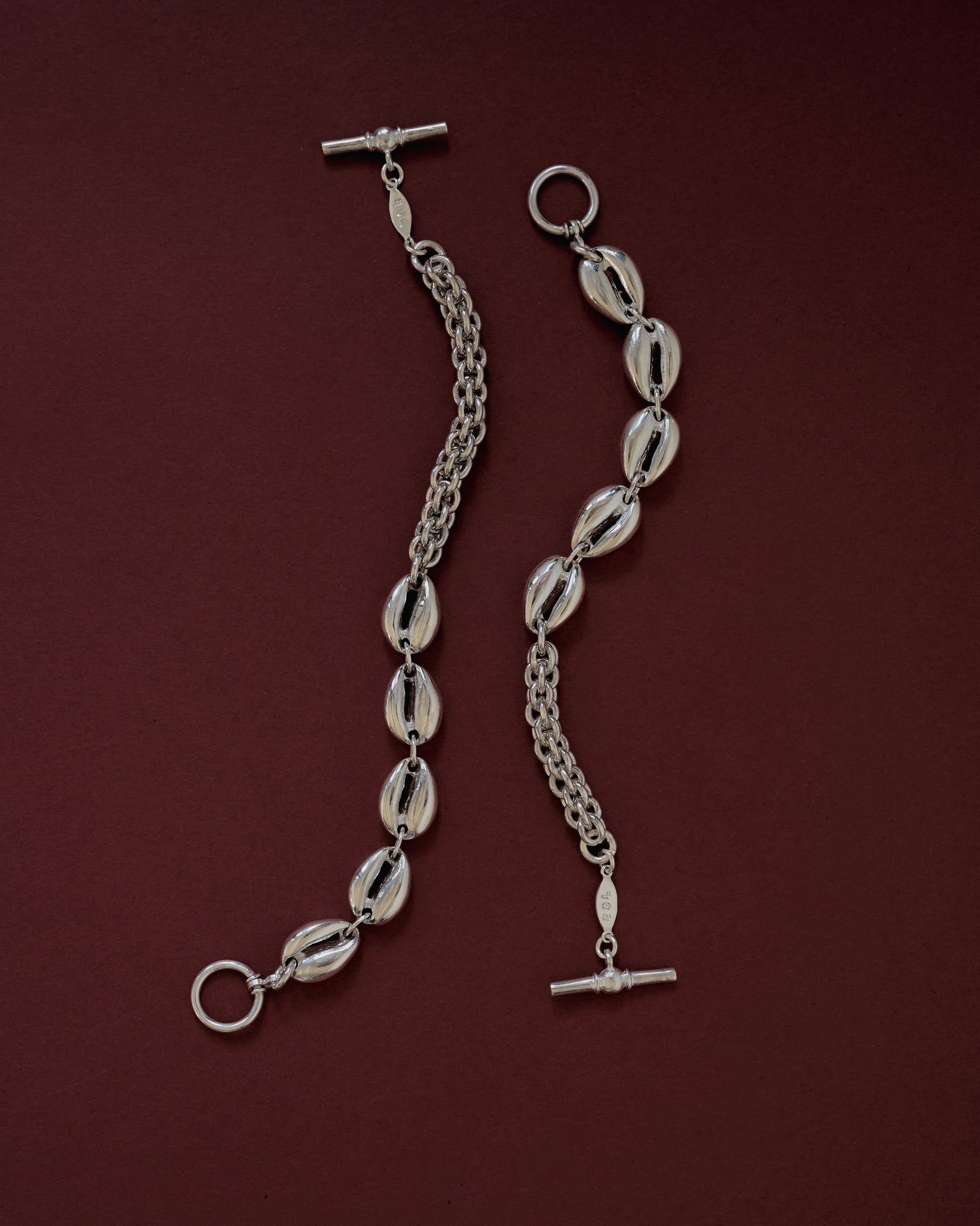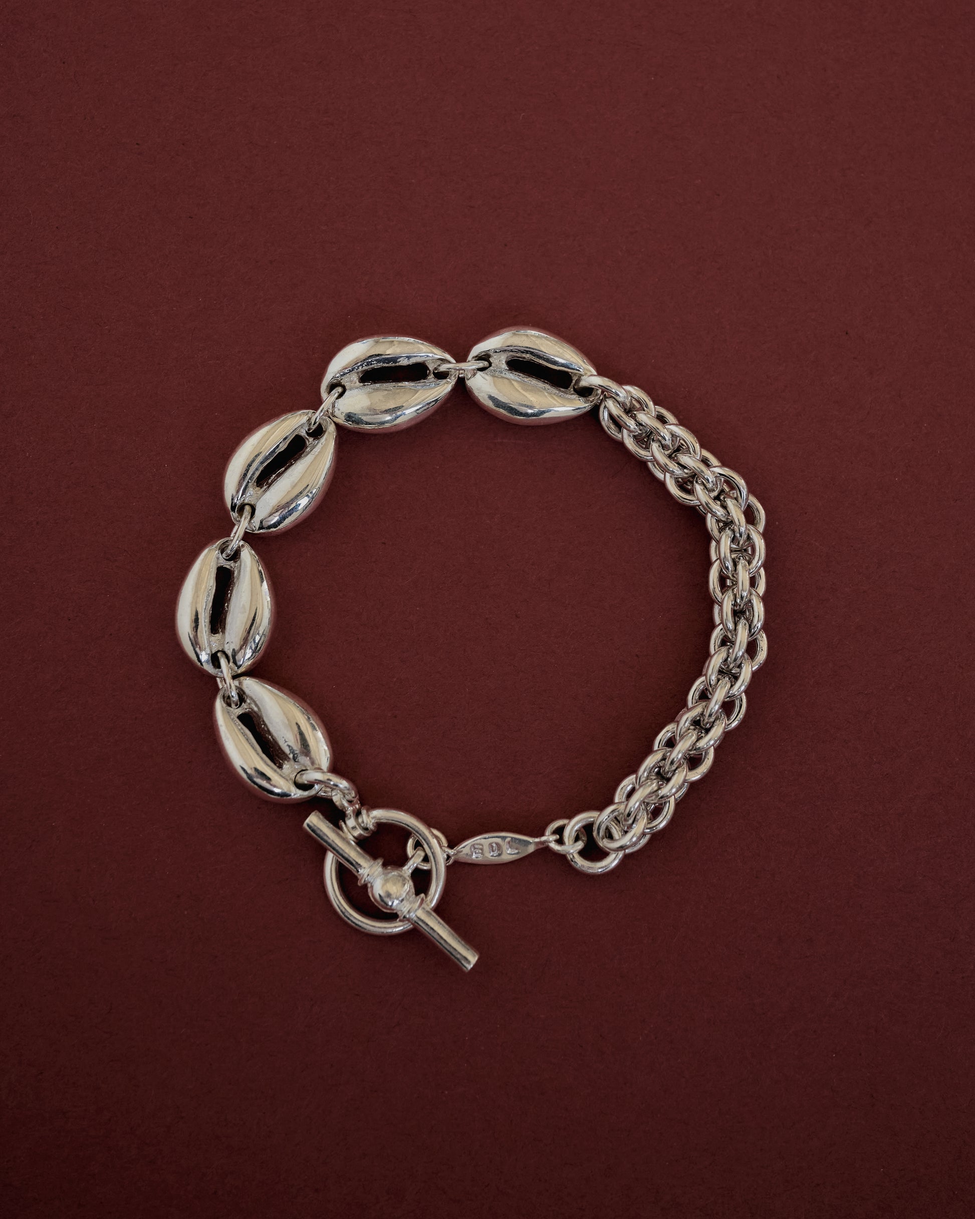 The Cowrie Collection is our laid-back take on timeless fine ewelry—crafted from fine silver and hand-carved from wax to capture the perfect vibe: 5 Chunky Cowrie Shell's cast in Solid Fine silver, 999 pure silver meet sleek double-chain action, finished with a toggle