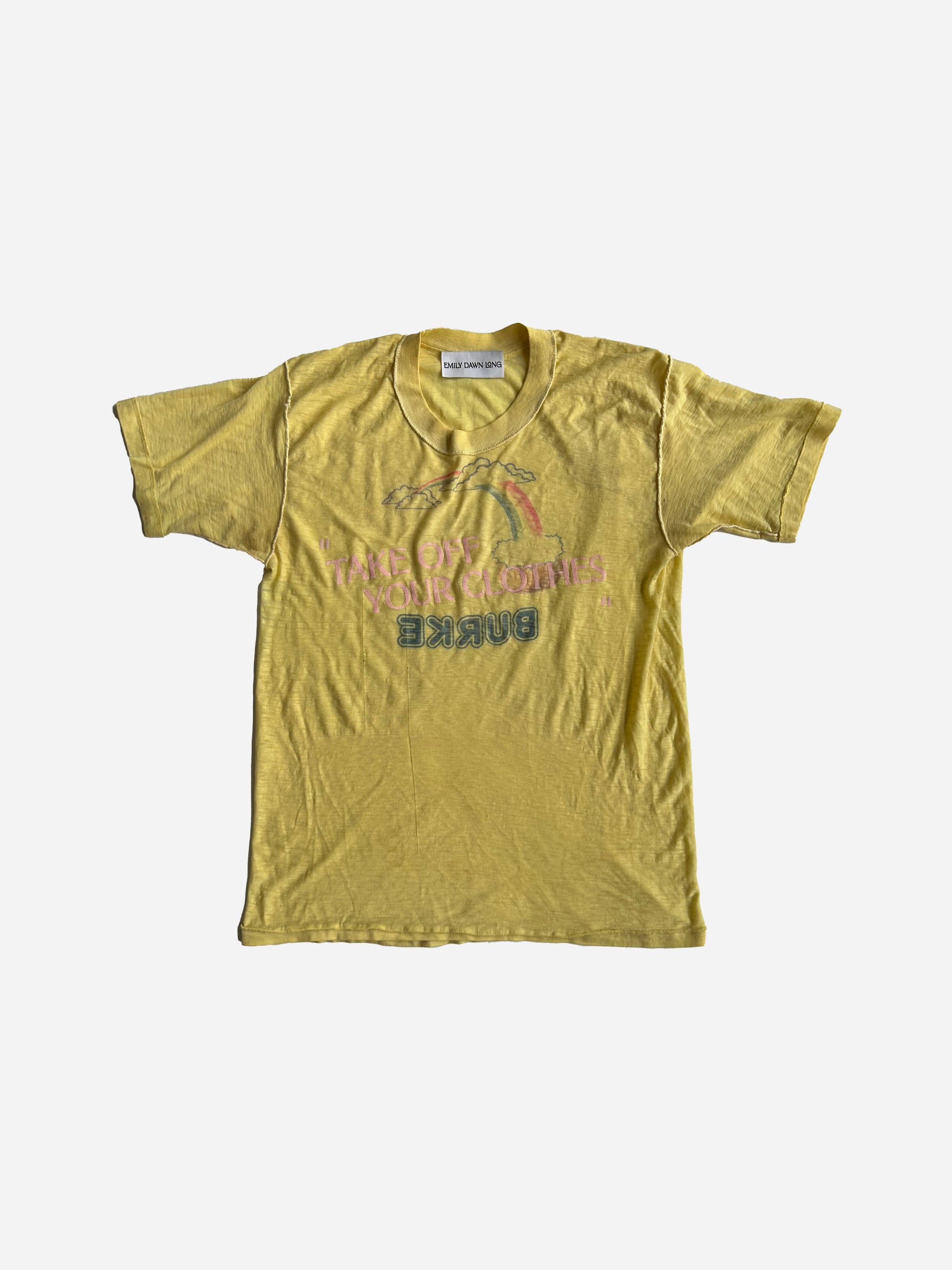 "TAKE OFF YOUR CLOTHES" are all very very very specifically sourced one of a kind vintage t shirts. That EDL deems perfect - screen printed on the reverse side in different colors in our EDL BRAND FONT. you get 2 amazing tees for 1