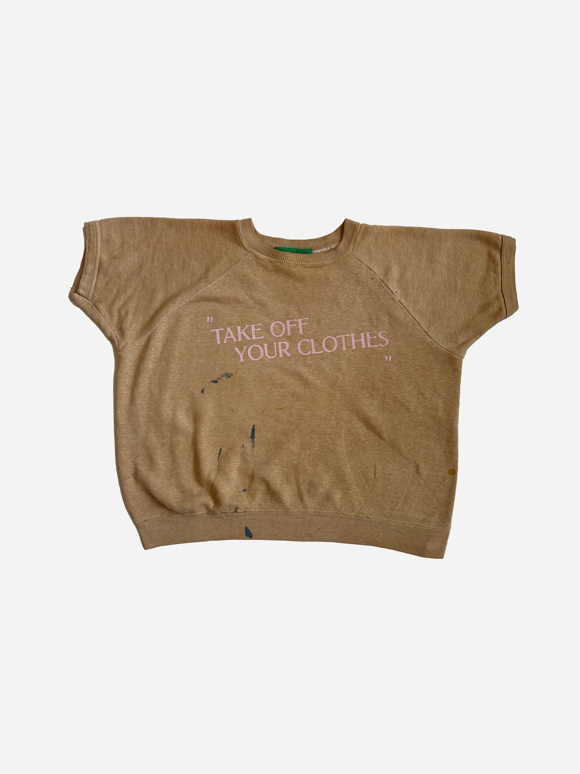 TAKE OFF YOUR CLOTHES" are all very specifically sourced one of a kind vintage sweatshirts - Emily deems perfect - screen printed in our EDL BRAND FONT.