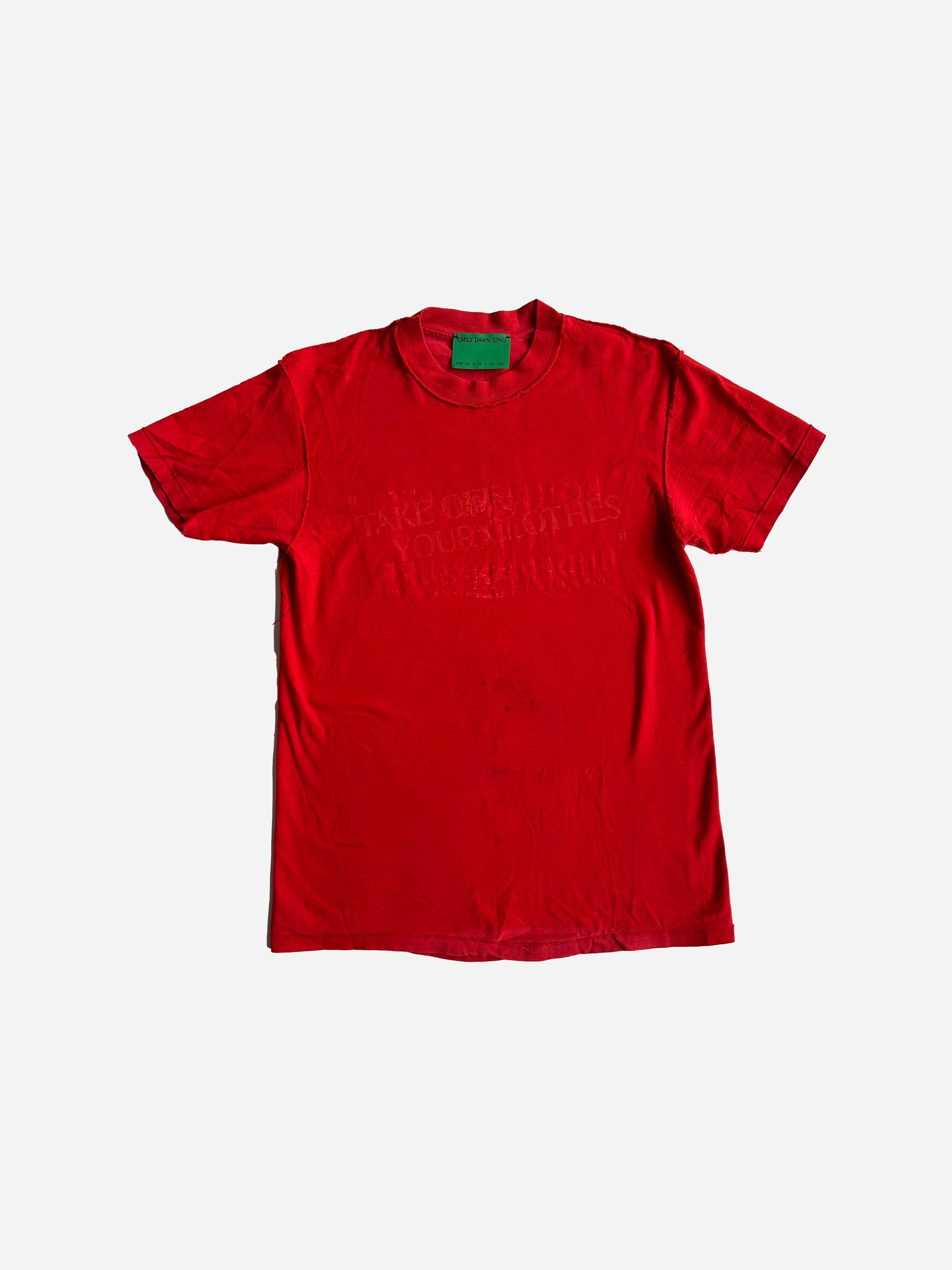 "TAKE OFF YOUR CLOTHES" are all very very very specifically sourced one of a kind vintage t shirts. That EDL deems perfect - screen printed on the reverse side in different colors in our EDL BRAND FONT. you get 2 amazing tees for 1