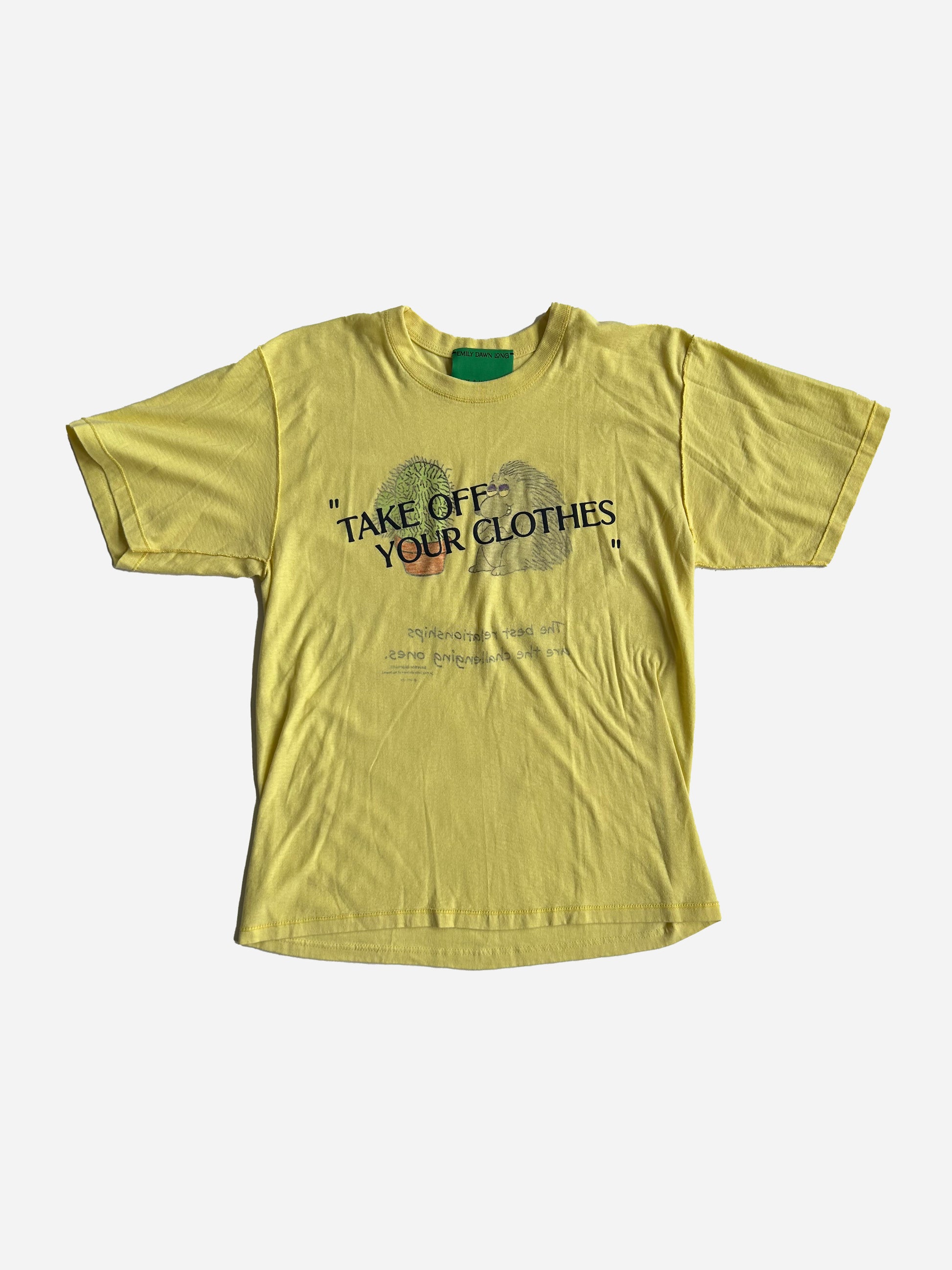 "TAKE OFF YOUR CLOTHES" are all very very very specifically sourced one of a kind vintage t shirts. That EDL deems perfect - screen printed on the reverse side in different colors in our EDL BRAND FONT. you get 2 amazing tees for 1