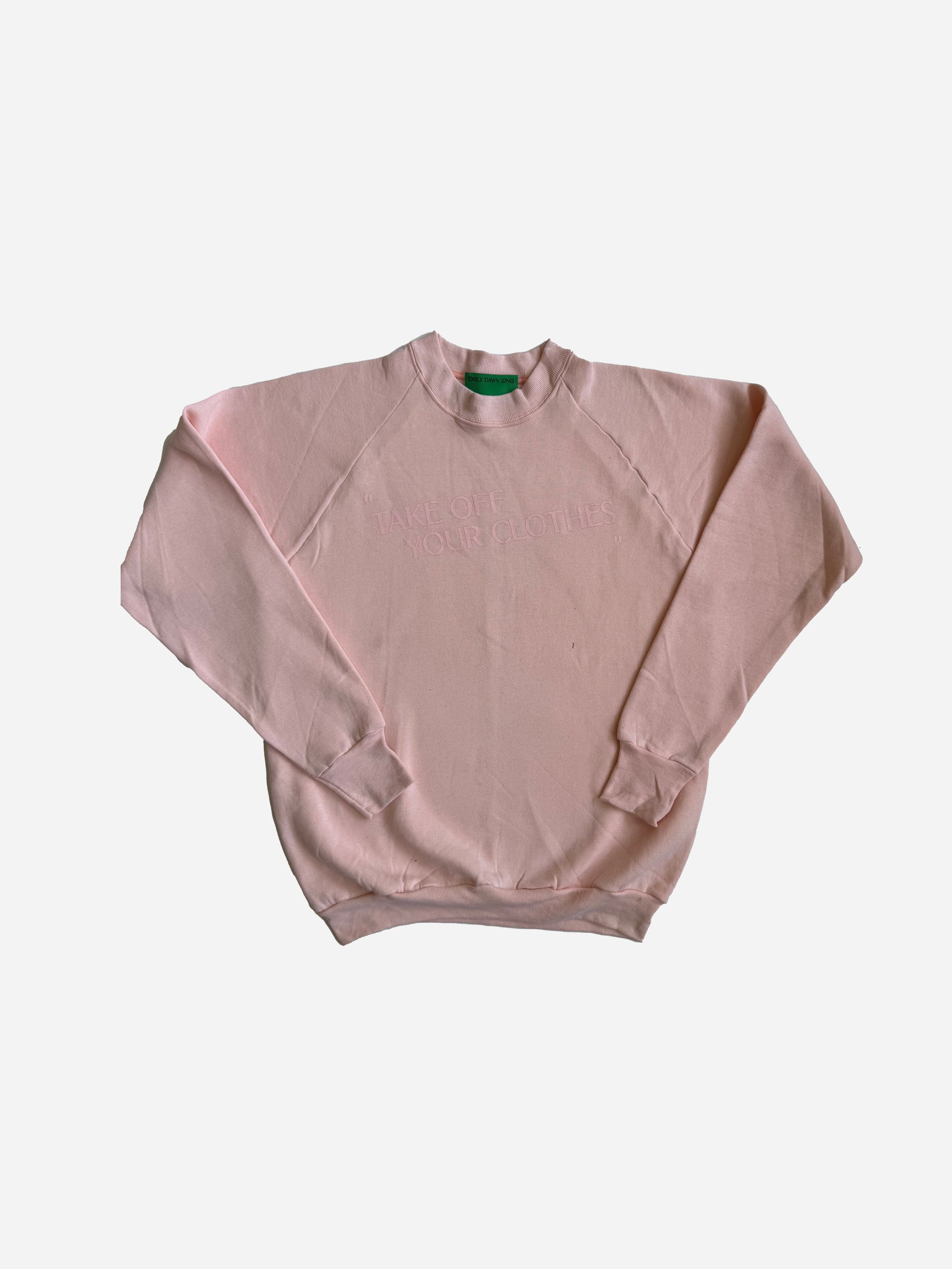 TAKE OFF YOUR CLOTHES" are all very specifically sourced one of a kind vintage sweatshirts - Emily deems perfect - screen printed in our EDL BRAND FONT.