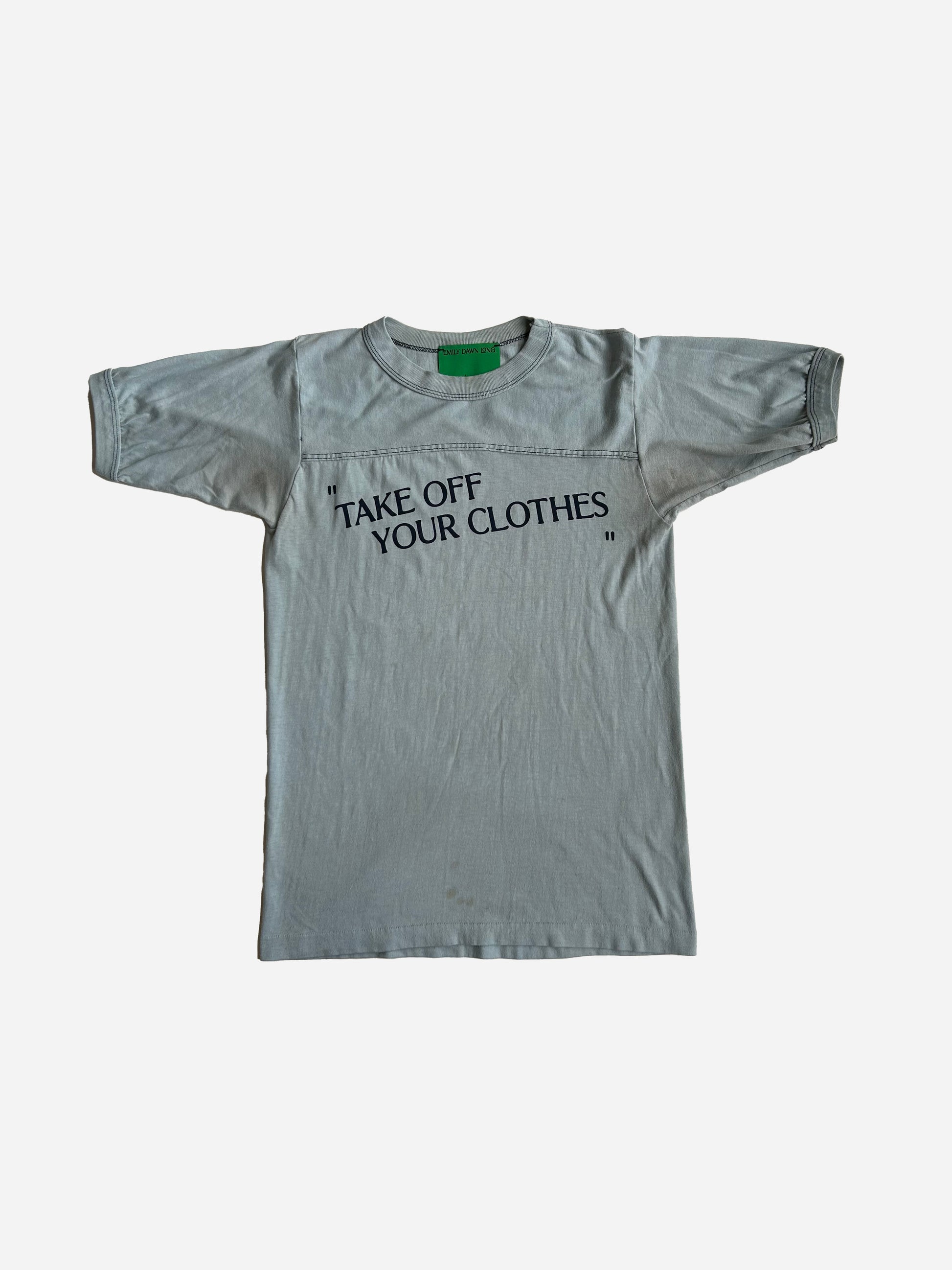 "TAKE OFF YOUR CLOTHES" are all very very very specifically sourced one of a kind vintage t shirts. That EDL deems perfect - screen printed on the reverse side in different colors in our EDL BRAND FONT. you get 2 amazing tees for 1