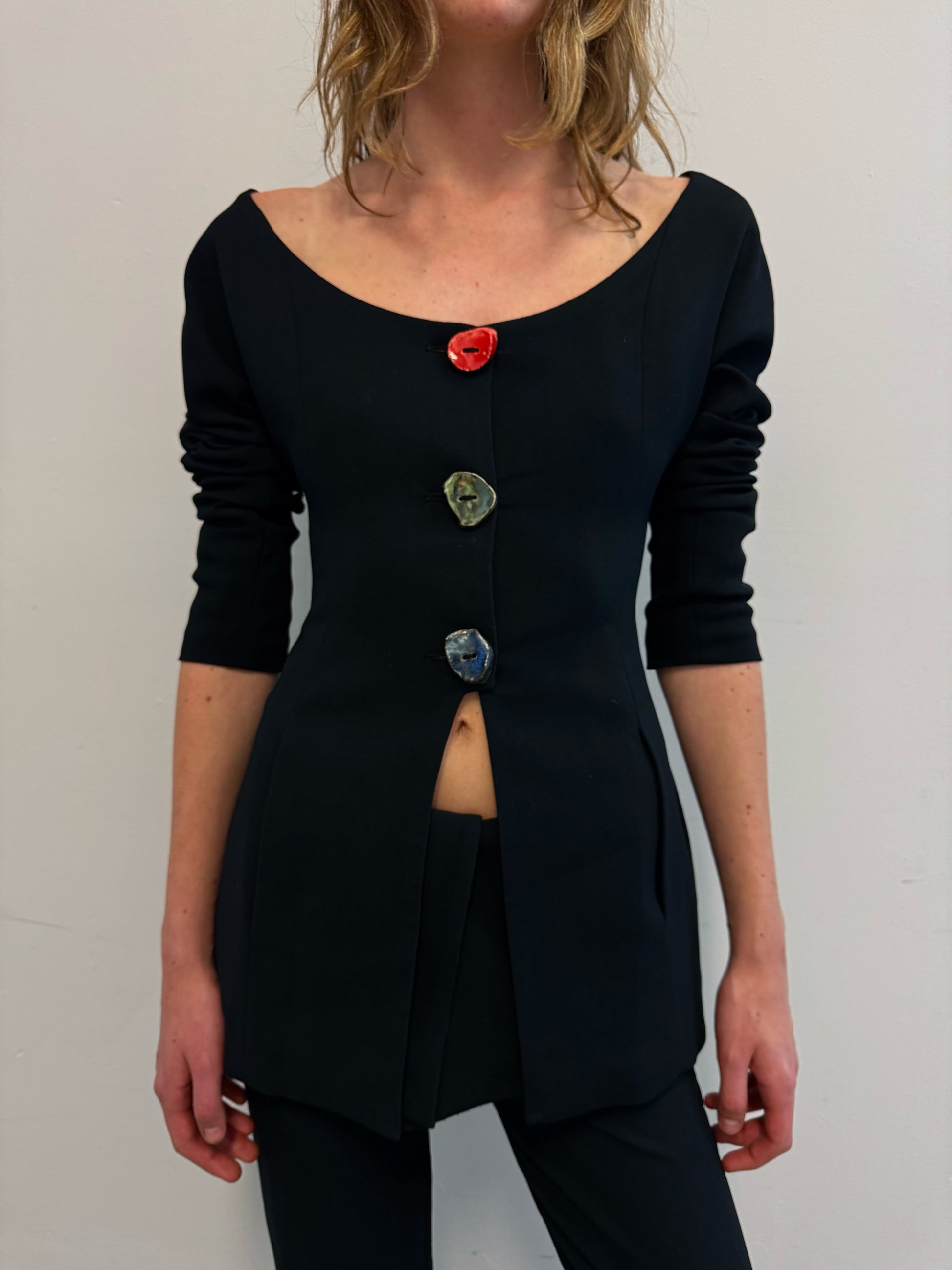 Our Black Wedding Blazer - It closes with a row of 3 organically glazed handmade ceramic buttons, made in collaboration with our friend and furniture designer Bennet Schlesinger. All unique to themselves no one alike in color and shape. Model in the images is wearing a size small.
